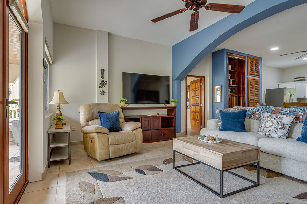 One of the villa’s standout features is its stunning views. From both the living area and the outdoor patio, you can take in the lush garden, sparkling pool, and the mesmerizing Caribbean Sea. The outdoor space is a true oasis, complete with a dining area for meals outdoors and ample seating to relax and soak up the sun. The tropical landscaping of the garden adds to the serene atmosphere, while the distant sound of the waves creates a peaceful soundtrack for your stay.